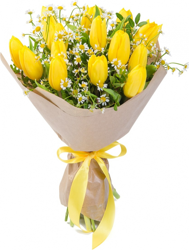 3 желтых тюльпанов, 1 ромашки матреаркария, упаковка, лента7 желтых тюльпанов, 3 ромашки матреаркария, упаковка, лента15 желтых тюльпанов, 5 ромашки матреаркария, упаковка, лента