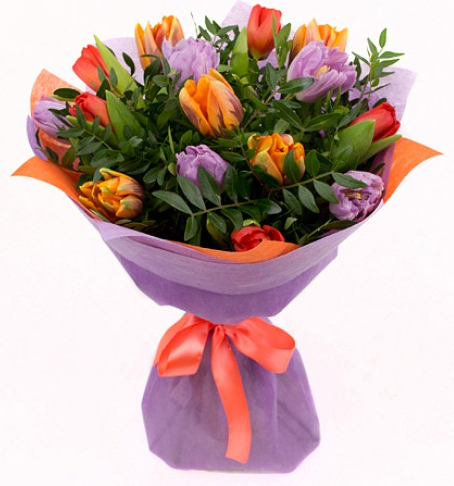 2 фиолетовых тюльпана, 1 рыжих тюльпана, 2 коралловых тюльпана, зелень, упаковка, лента3 фиолетовых тюльпана, 3 рыжих тюльпана, 3 коралловых тюльпана, зелень, упаковка, лента5 фиолетовых тюльпанов, 5 рыжих тюльпанов, 5 коралловых тюльпанов, зелень, упаковка, лента